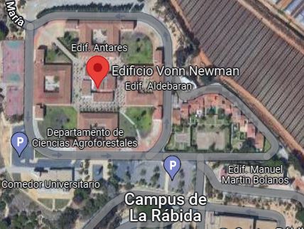El inmueble forma parte de un conjunto de cuatro pabellones perimetrales, siendo éste el pabellón central, ubicado en la parte alta del Campus universitario de La Rábida.