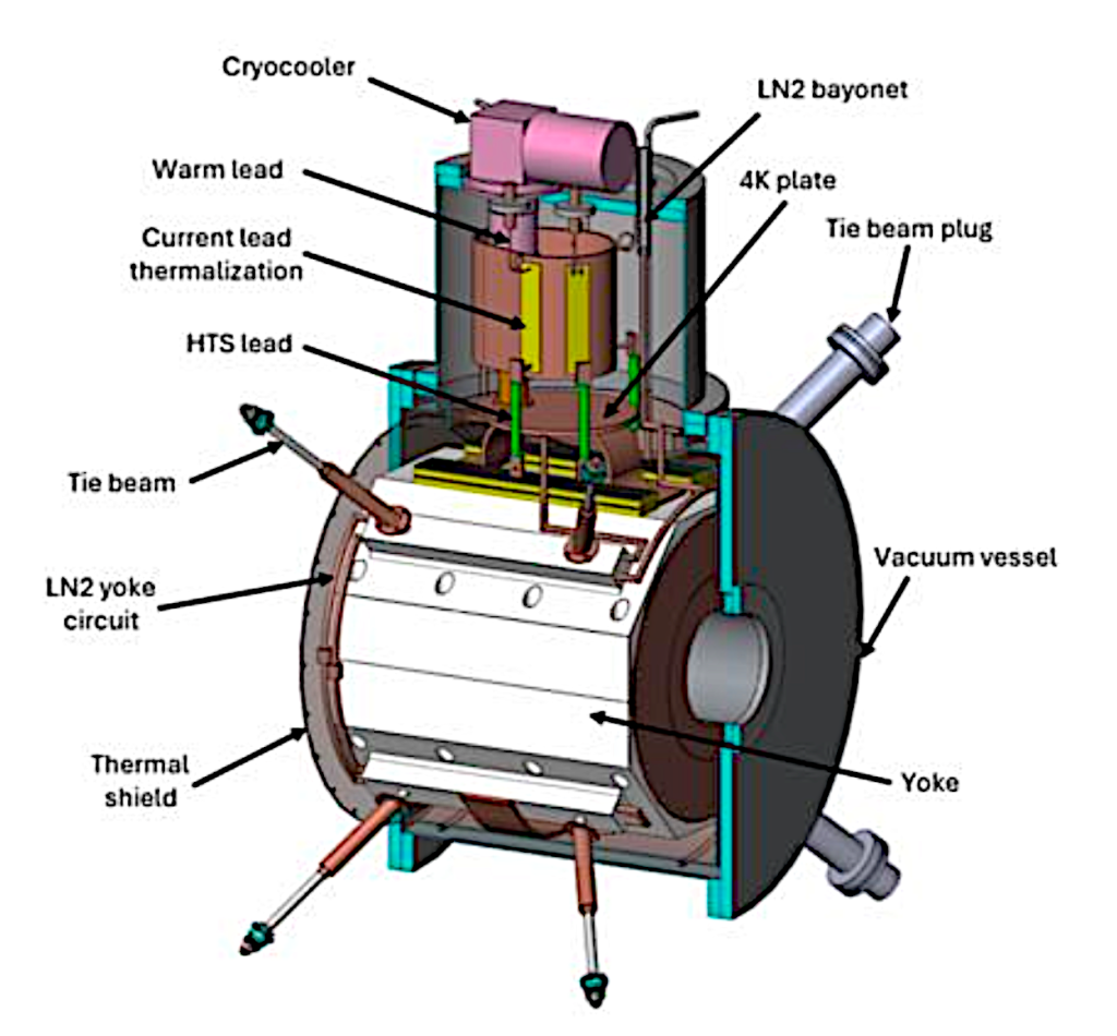 The University of Huelva is leading the development of the innovative superconducting magnets to demonstrate the operation principle ISRS.  The task focus on the design and optimization of a multifunction (dipole + quadrupole) super low-weight iron-free helium-free Canted Cosine-Theta superconducting magnet, the so called MAGDEM prototype (MAGnet DEMonstrator), operating at 4.5 T. MAGDEM units are the building blocks of the ISRS particle storage ring. The innovative design operating at 100 A incorporates a dipole coil of 2.2 T peak field within a quadrupole coil of 9 T/m, cooled by cryocoolers, and a 200 mm beam tube at room temperature for radioactive ion beam circulation. The complete system including cryostat has only 750 mm length and weights less than 500 Kg. Interestingly MAGDEM units can also be used for other accelerator applications demanding compact lightweight superconducting magnets, such as future recirculating beam rings for HIE-ISOLDE or medical hadron therapy systems.