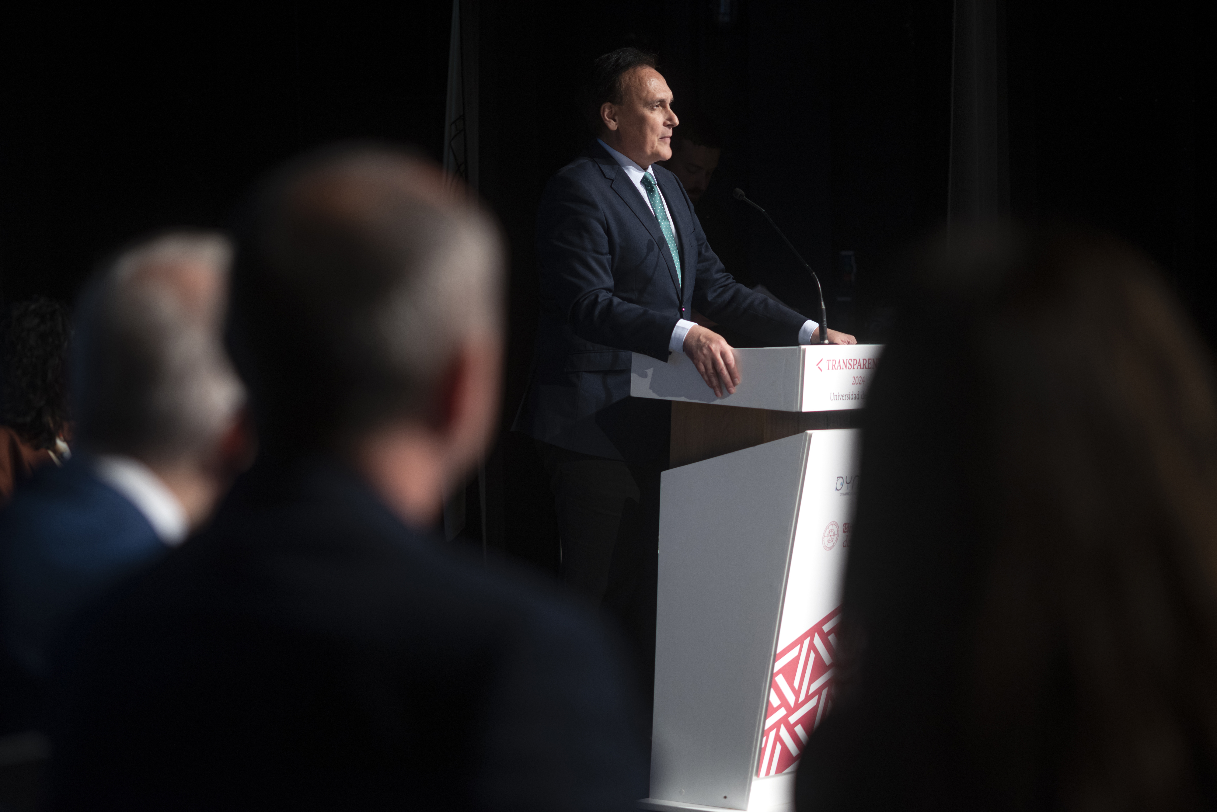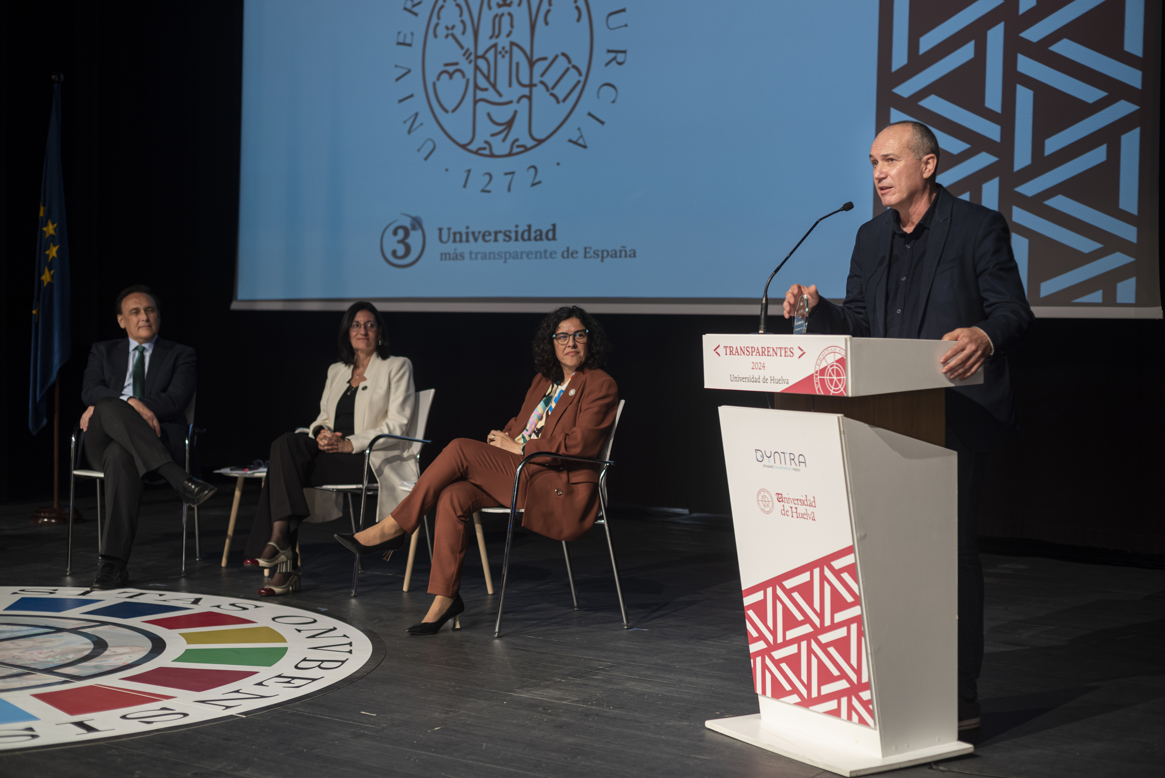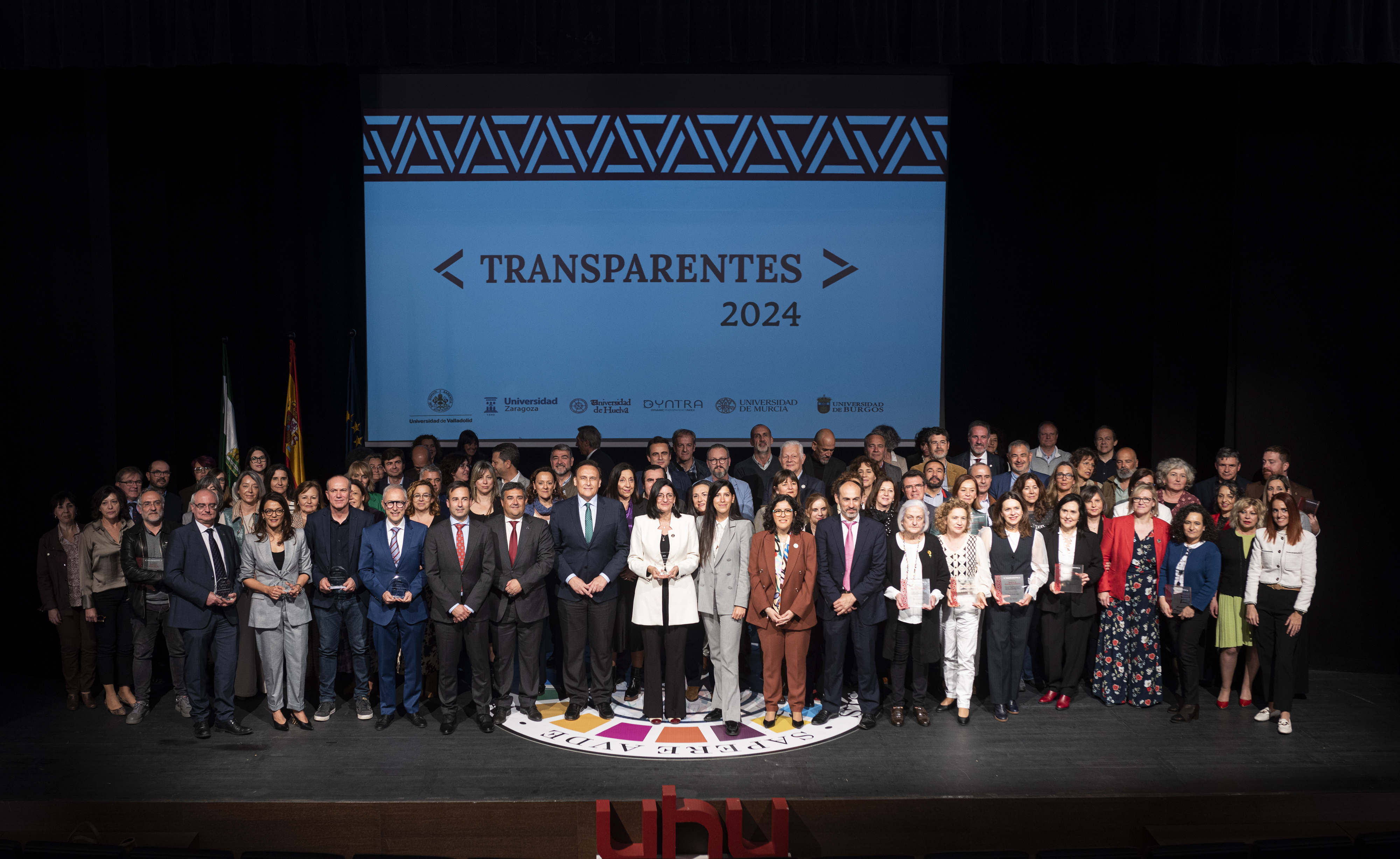 El acto de entrega de reconocimiento a la Universidad de Huelva como Administración Pública más transparente de España y primera universidad del ranking, junto a representantes de las universidades de Burgos, Valladolid, Murcia y Zaragoza que ocupan el segundo y terceros puestos de la clasificación, ha tenido lugar hoy en el Auditorio de la UHU, con la presencia de María Antonia Peña, rectora Universidad de Huelva; José Carlos Gómez Villamandos, consejero de Universidad, Investigación e Innovación de la Junta de Andalucía y Ana Gloria Gómez, directora de Evaluaciones de DYNTRA.