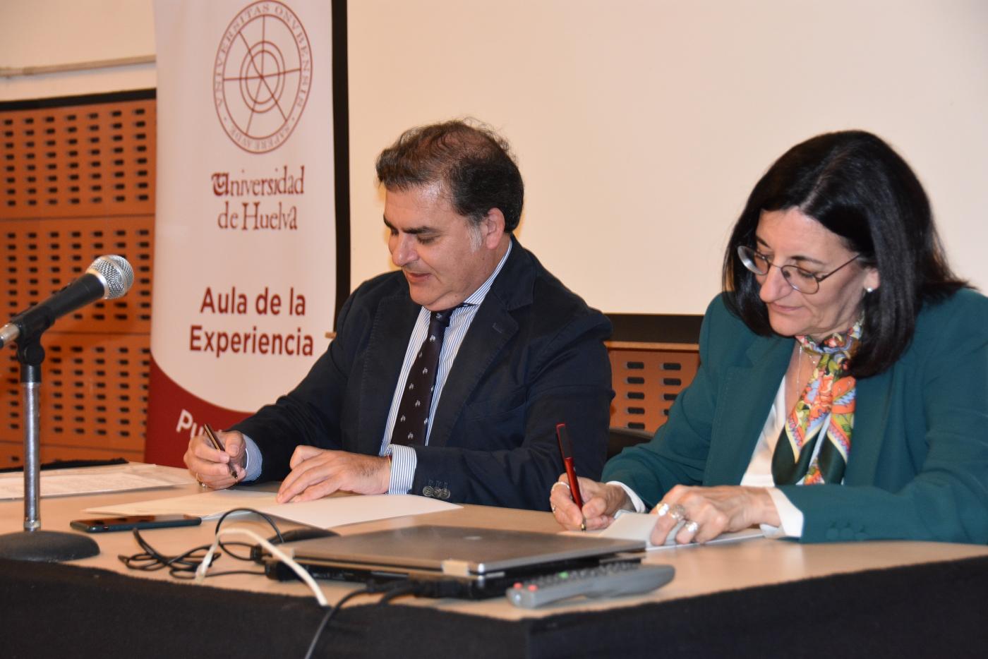El alcalde de Punta Umbría, José Carlos Hernández Cansino, y la rectora de la Universidad de Huelva, María Antonia Peña, han firmado este jueves un convenio entre el Ayuntamiento costero y la UHU para el desarrollo del Aula de la Experiencia en la localidad.