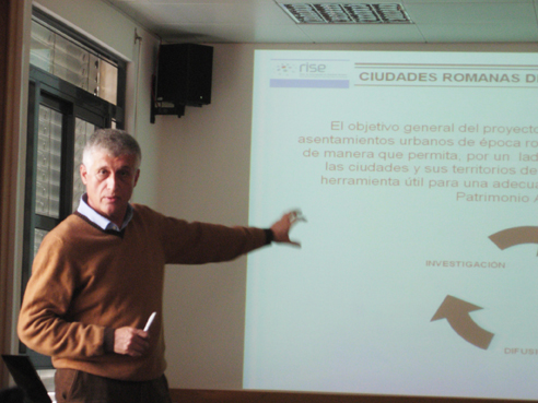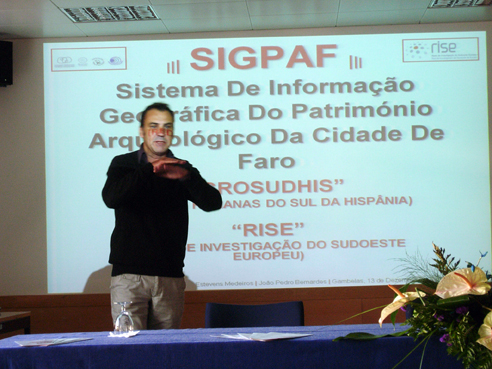 A continuación, João Pedro Bernardes (Universidad de Algarve) y Juan Campos (UHU), subproyecto CROSUDHIS, presentaron “Ciudades romanas del sudoeste de Hispania. Investigación y difusión”, donde se demostró la importancia de divulgar los resultados del estudio para hacer llegar la información la sociedad, por ejemplo a través de los SIG (Sistemas de Información Geográfica), Internet, itinerarios de visita, centros de investigación, etc.