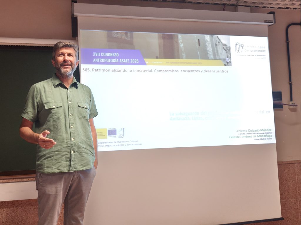Durante estos días, nuestra IP, Celeste Jiménez de Madariaga, y los compañeros del proyecto, Aniceto Delgado Méndez y José Carlos Mancha Castro, están participando en el XVII Congreso Internacional de Antropología. En concreto, nuestro compañero Aniceto, coordina junto con la Profesora Grecy Pérez Amores el simposio «Patrimonializando lo inmaterial. Compromisos, encuentros y desencuentros», en el que también han participado con los trabajos «Estrategias de legitimación en el Patrimonio Cultural Inmaterial UNESCO. Reflexiones a partir del caso del Silbo Gomero», «La salvaguarda del patrimonio cultural inmaterial en Andalucía. Listas, catálogos e inventarios» (Celeste Jiménez y Aniceto Delgado) y «El proceso de patrimonialización de la fiesta de la Mare de Déu de la Salut (Algemesí)» (José Carlos Mancha), fruto de los trabajos de investigación de nuestro proyecto PCImpact.