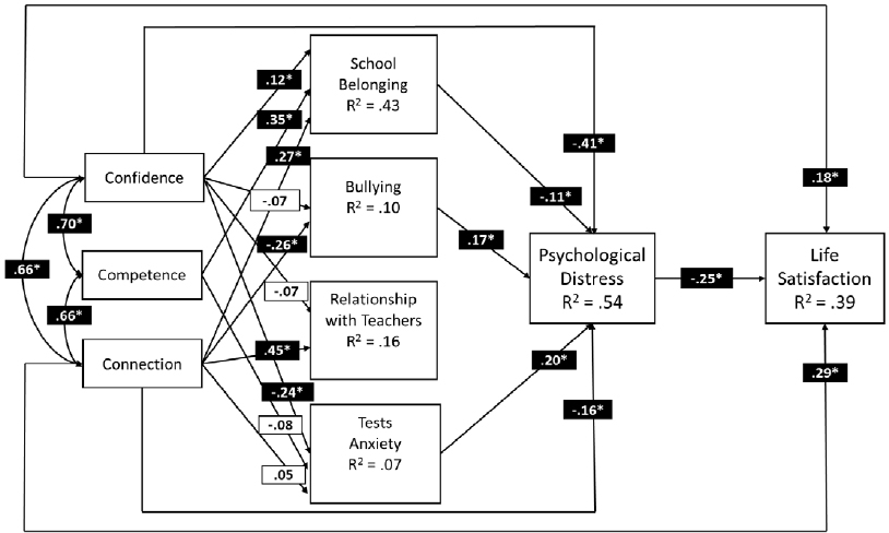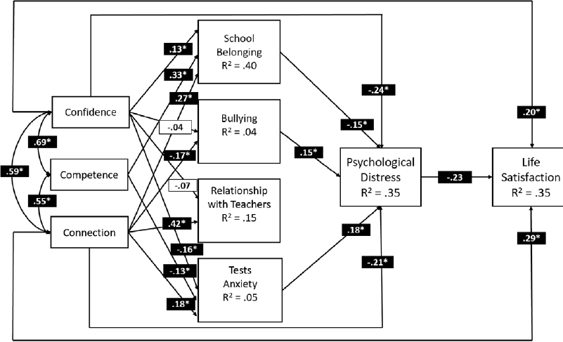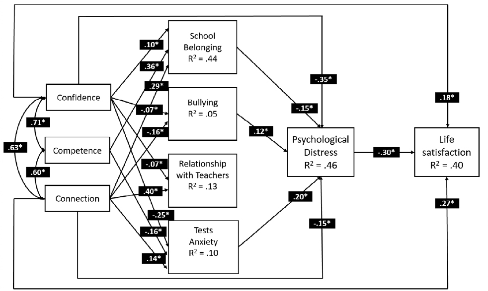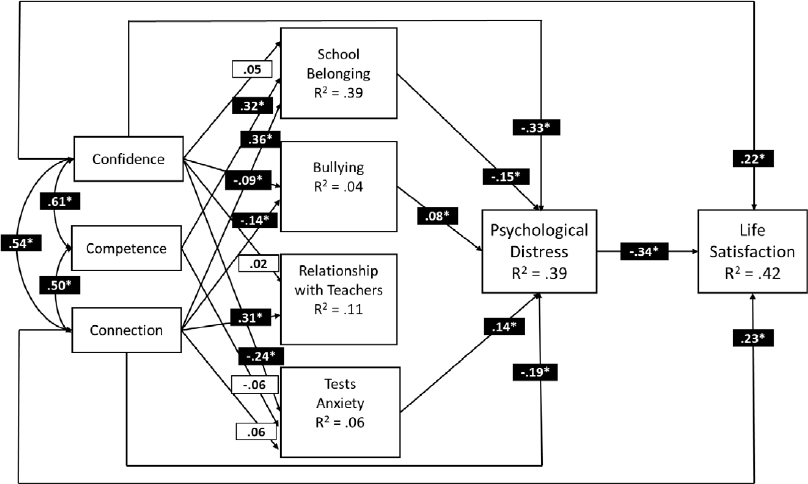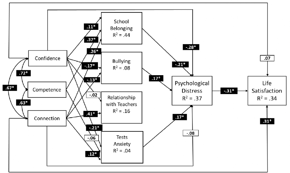 This study analyzes the relationship between PYD attributes and life satisfaction and the mediating role of school-related variables and psychological distress. Based on the literature, a path model was developed where PYD variables (confidence, connection, and competence) are associated with life satisfaction through school-related variables (school belonging, bullying, relationship with teachers, and test anxiety) and psychological distress.