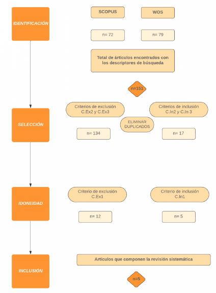 A la hora de recopilar los datos, como mencionamos anteriormente, se siguió el protocolo PRISMA, dividiendo el proceso en 4 etapas. La primera etapa sería de identificación, que contiene todos los artículos que se encuentran en las bases de datos utilizadas con los criterios de búsqueda mencionados anteriormente. En esta primera etapa se localizaron un total de 151 artículos. La segunda etapa es de selección, donde se eliminaron las referencias duplicadas y las que coinciden con el criterio de exclusión (C.Ex.2 y C.Ex 3) expuestos en el cuadro 1. Al final de la etapa 2 se eliminaron 134 artículos, quedando 17 artículos para el estudio. Una tercera fase de idoneidad, en la cual se analizaron los documentos para sacar los que responden a los objetivos de la investigación y se ajustan al criterio de inclusión, desechando el resto (C.Ex.1), se desecharon otros 12 artículos y por último, la etapa de inclusión, en la que se recogen todos los artículos que componen la muestra de la investigación, finalmente compuesta por 5 artículos. La búsqueda se realizó a principios de agosto de 2024 incluyendo todos los artículos subidos en las bases de datos de Scopus y Web of Science desde el año 2010 hasta la fecha arriba indicada