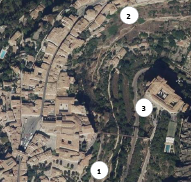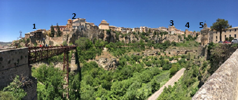 Desde los jardines del Parador de Turismo y el Espacio Torner al otro lado de la hoz, se encuentran puntos de vista inmejorables de la fachada urbana orientada al este (Figura 2). De izquierda a derecha se suceden las Casas Colgadas (Museo de Arte Abstracto Español) -1-, la catedral -2-, la iglesia barroca de San Pedro -3-, el convento de las Carmelitas Descalzas (Fundación Antonio Pérez) -4-, y las antiguas fábricas del Tribunal de la Inquisición (Archivo Histórico Provincial) -5-, alternadas con el caserío. Los edificios se enriscan sobre los muros verticales del cañón, resultado de la angostura del terreno y la perpendicularidad del acantilado, que obligan a buscar los cimientos a gran profundidad, como en el convento de las Carmelitas (Ibáñez, 1997: 11), edificio en el que se ubica la Fundación Antonio Pérez.