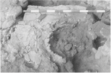 Figura 8.- Plataforma de arcilla fragmentada por desplome y cubriendo seis vasos de cerámica a mano.
