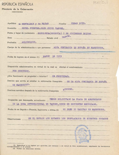 2 Montalbán señala como su fecha de nacimiento el 1 de diciembre de 1890 en un documento sin fechar (pero que, por su contenido, podemos datar en el año 1945, inmediatamente posterior a su llegada a Tánger como refugiado), dirigido al Ministerio de Gobernación de la República en el exilio donde señala su pertenencia a la administración de la Alta Comisaría desde 1919 como funcionario, habiendo ganado su plaza de arqueólogo en dicha administración por concurso.