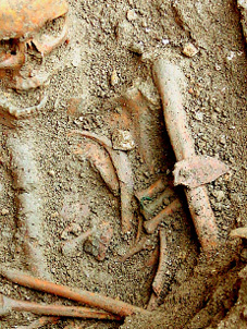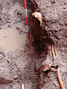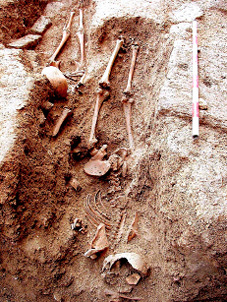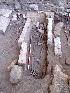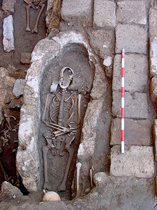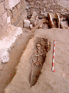 En lo que respecta a la colocación, se documentan también anomalías importantes. Los cuerpos aparecen en ocasiones con las piernas imperfectamente cruzadas o parcialmente flexionadas, con la columna vertebral anormalmente curvada, o con la cabeza caída post mortem hacia un lado. También existen casos en los que el cadáver se encuentra colocado en decúbito lateral parcial, tanto izquierdo como derecho (enterramientos nº 11, 33 y 71), sin que ello tenga relación alguna, por supuesto, con ritos de enterramiento islámicos (figura 25). Pero el caso más llamativo es, sin duda, el de un varón adulto que apareció en decúbito prono (enterramiento nº 26), lo que, en opinión del Dr. D. Juan Zozaya Stabel-Hansen, podría deberse a que el individuo en cuestión era un falso converso, hipótesis ciertamente verosímil en relación con el contexto sociorreligioso de la época (figura 26).