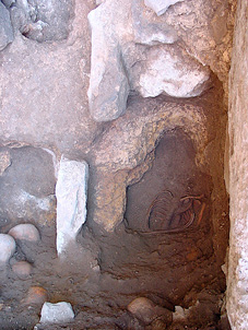 El ritual de enterramiento empleado en este periodo presenta unas constantes muy definidas. Así, la cabeza del individuo, en todos los casos en que se ha conservado, aparece sujeta en su posición original de enterramiento por tres piedras irregulares: una a cada lado del cráneo para evitar la caída lateral de éste, y otra más bajo la barbilla, para prevenir la caída de la mandíbula tras la descomposición del cadáver y de su mortaja (figura 7). La cabeza era colocada, en ocasiones, muy levantada, casi en posición vertical (enterramientos nº 161, 171 y 176), lo que obligaba, probablemente, a la rotura de las vértebras cervicales del individuo durante el proceso de inhumación. En otros casos aparece tan sólo ligeramente levantada (enterramiento nº 131), formando con respecto a la horizontal un ángulo inferior a 45º. Otras veces, por último, aparece en posición completamente horizontal (enterramiento nº 153).