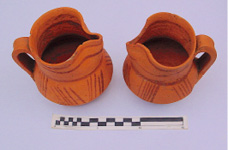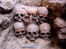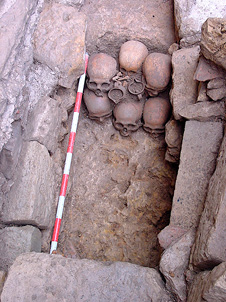 En efecto, el hueco de cabecera de la antigua tumba rupestre antropomorfa nº 233 estaba ocupado, bajo la cubierta de la cista nº 192, por una extraña reducción ritual de restos integrada por ocho cráneos sin mandíbula y dos jarritas de cerámica común pintada post cocción (figura 12). Los cráneos están colocados en posición vertical, mirando hacia el este y distribuidos en dos hiladas superpuestas: la hilada inferior la forman cinco cráneos —tres al este y dos detrás—; la hilada superior está formada por los tres cráneos restantes, alineados en dirección norte-sur y retranqueados hacia el oeste con respecto a los tres cráneos delanteros del nivel inferior (figura 13). En el espacio libre dejado por dicho retranqueo, y sobre la bóveda de los cráneos delanteros del nivel inferior aparecieron, cuidadosamente colocadas, dos jarritas completas con asa, decoradas con líneas de color vinoso pintadas post cocción, que podemos fechar en el siglo XIII (figura 14).