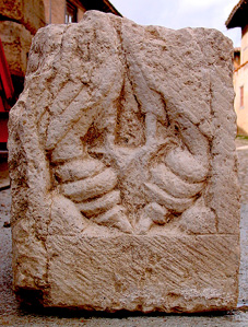 La cista nº 140, por último, se localiza en el ángulo sureste del sondeo, sobre la cubierta de las cistas nº 130 y 184, de modo que pertenece, claramente, a un segundo momento dentro de la fase de enterramientos en cista que nos ocupa. Aprovechó como lecho la cubierta de losas de la cista nº 184, y entre las piezas que configuraban su forro perimetral se halló, reutilizado, un fragmento de relieve de traza románica en el que se representan dos aves del paraíso enfrentadas (figura 15). Resultó casi completamente destruida por los enterramientos de la tercera fase; de hecho, no se han documentado restos de cadáveres asociados a esta cista.