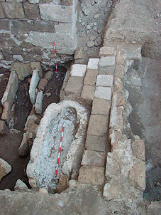 Inmediatamente después de la construcción de dicho contrafuerte fue levantada, en el solar objeto de nuestra intervención, una amplia capilla lateral de planta rectangular que dio cobijo, al menos, a un sarcófago monolítico situado junto a su límite septentrional (figuras 19 y 34). Los enterramientos en sarcófago dentro de un espacio cubierto constituyen, pues, la cuarta fase dentro de la evolución de la necrópolis que nos ocupa.