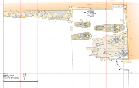 En el interior de las diez cistas documentadas fueron localizados un total de veintiún enterramientos, así como una reducción colectiva de restos —en el interior de la cista nº 189— y un osario —en el interior de la cista nº 184—. De los veintiún enterramientos individuales, sólo en cinco casos se conservaba el cadáver completo; los dieciséis individuos restantes aparecieron destruidos, en mayor o menor grado, por otros enterramientos —de la misma fase o de otras posteriores—, o por la construcción del contrafuerte norte de la iglesia (figura 2).