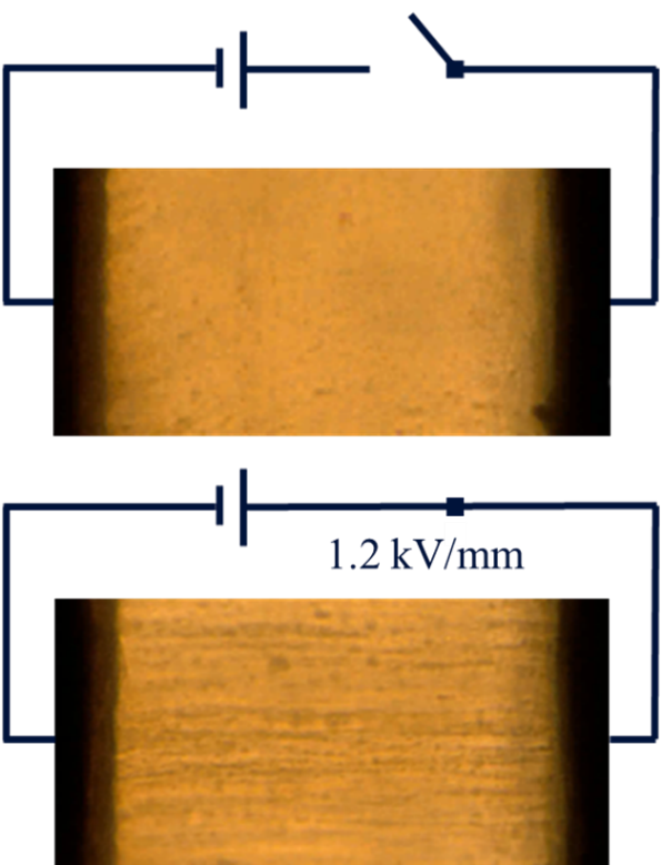Una vez polarizadas, las partículas se alinean según la dirección del campo eléctrico generado por la d.d.p. (diferencia de potencial) entre ambos electrodos, y se organizan en estructuras columnares como las de la figura inferior: