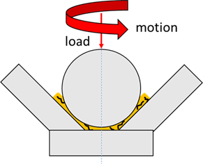 - Prevención de la eyección del lubricante a altas velocidades, gracias al aumento de viscosidad inducido por el campo eléctrico, y al propio confinamiento activo del fluido dentro de la zona de rodamiento originado por el campo eléctrico, que lo mantiene adherido a las superficies en movimiento incluso a altas velocidades. (ver figura).
