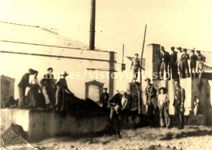 Trabajadores y habitantes de Isla Cristina sobre las calderas para el alquitranado de los artes de pesca, que se localizaban en un solar junto a las fábricas de conservas Pérez y Pérez (una de sus naves se puede ver en el último plano de la fotografía). El “entinte” de las redes era fundamental para evitar que el salitre del mar las deshiciera en poco tiempo (redes hechas con material vegetal)*. Era necesario alimentar la caldera con un importante suministro de madera para mantenerla en continuo funcionamiento.