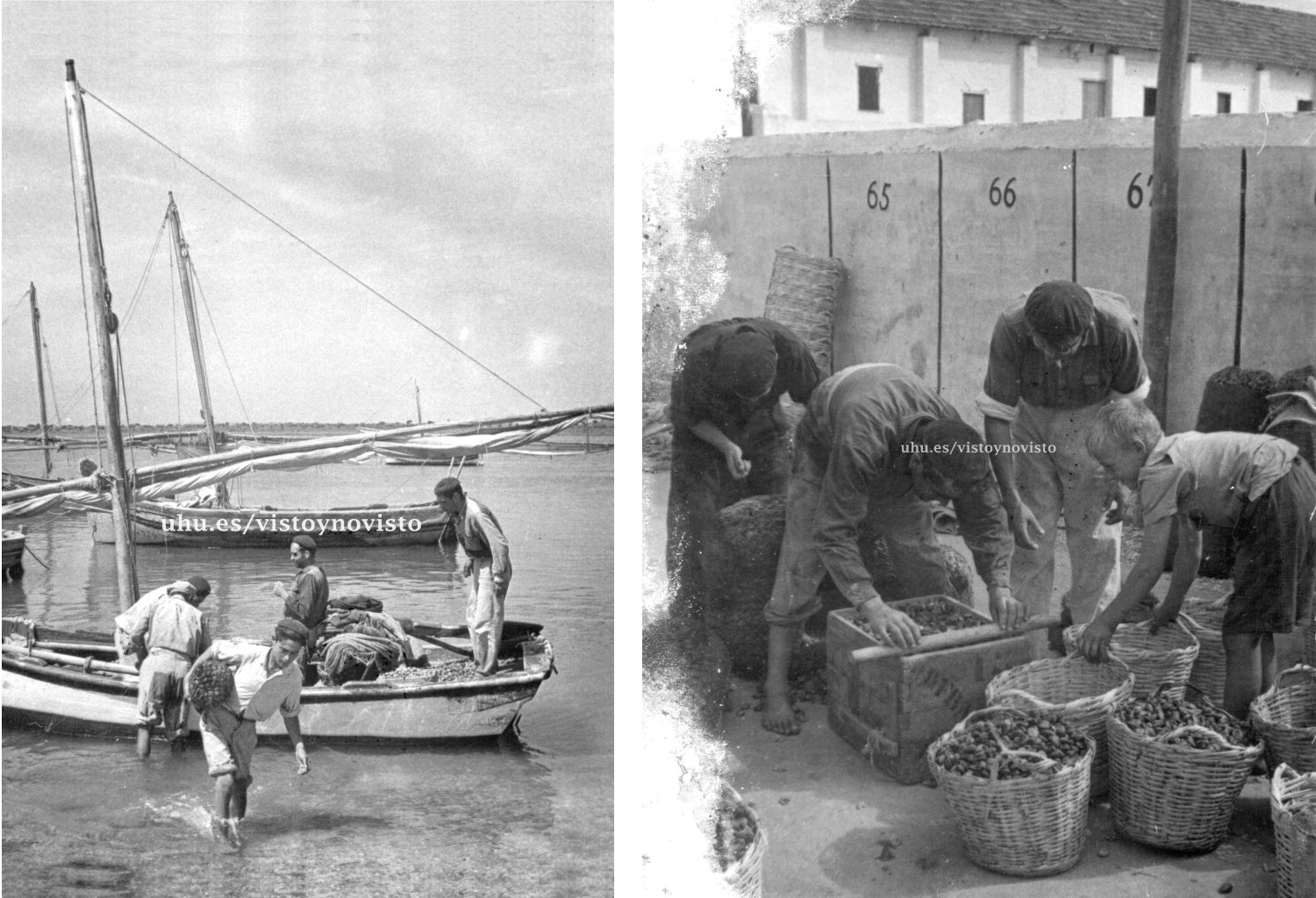 Las dos instantáneas nos muestran la descarga del marisco en puerto y su primera preparación en cajas para el transporte.