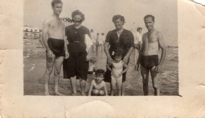 En esta fotografía podemos ver a la familia y amigos de Manuel Lazo Cejudo (Manuel Lazo Cejudo, primero por la izquierda) en un día de playa. Todos originarios de Valverde del Camino, enclavado en la comarca interior y minera del Andévalo.