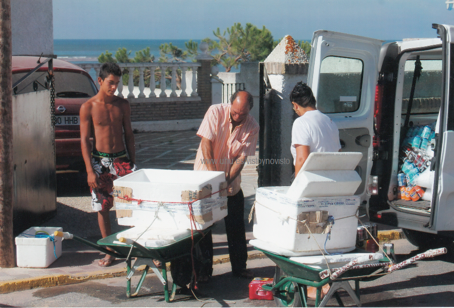 La primera de ellas nos muestra los preparativos y la carga de productos de consumo para los bañistas, como pueden ser patatas fritas y diferentes latas de refrescos. Estos productos son almacenados en cajas de corcho o bidones llenos de hielo para que conserven la temperatura óptima para su ingesta.