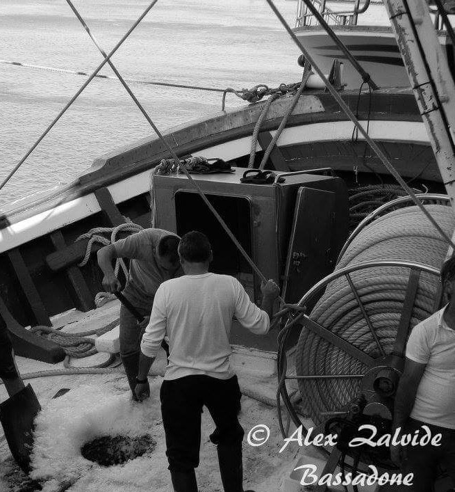 En esta fotografía vemos a los marineros recogiendo el hielo triturado que cubre la cubierta de un barco atracado en el muelle, tras la retirada de la manguera de carga de la fábrica de hielo. El proceso de descomposición progresiva que sufren el pescado y el marisco desde el momento de su captura es irreversible. Por ello, la aplicación de frío al pescado debe comenzar en los barcos, desde el mismo momento de la extracción del mar, manteniendo la denominada “cadena de frío” en todas las etapas de la distribución hasta llegar al consumidor. El hielo es el mejor aliado para la conservación ya que el proceso de enfriado es muy rápido, por su contacto directo con el pescado. Esto permite mantener el pescado a una temperatura constante cercana a los 0º, pero sin llegar a congelarlo. Finalmente, hace que la muerte del pez se produzca por “choque térmico” para su conservación como pesca fresca.