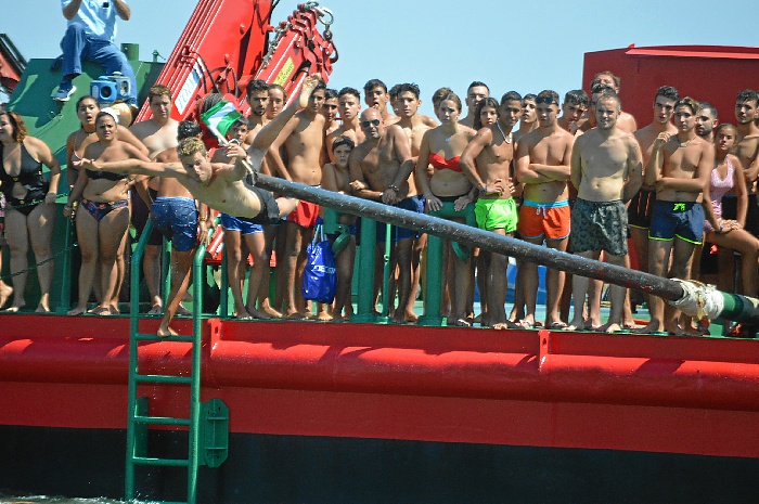 Consiste en un palo o mástil resbaladizo dispuesto al borde de la cubierta de un barco o de un puerto. Los participantes intentarían atrapar el objetivo que está en la punta. En este caso es una bandera pero en otras localidades pueden ser otros premios como alimentos. En los pueblos sin tradición marinera el palo se coloca en vertical en algún lugar público.
