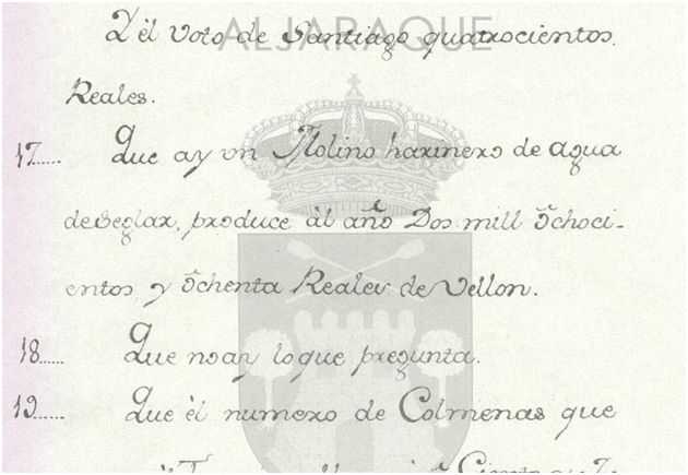 En el documento de mediados del siglo XVIII arriba reproducido, se acredita la existencia de un “MOLINO HARINERO DE AGUA” en la zona de las Cojillas de Aljaraque, propiedad del duque de Medina Sidonia que proporcionaba unas rentas anuales de dos mil ochocientos ochenta y ocho reales de vellón.
