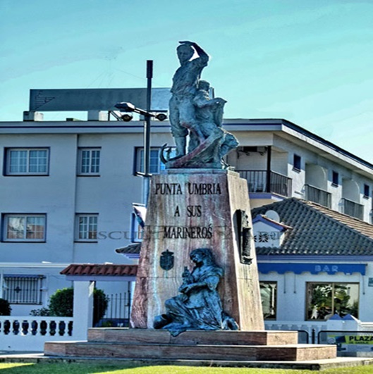 En esta imagen están representadas dos de las realidades más representativas de Punta Umbría, por una parte, la pesca que constituye el principal motor económico de la localidad y por otra parte la devoción a la Virgen del Carmen. La escultura, realizada en barro, representa la agonía que vivían las familias de los pescadores cada vez que estos salían a faenar y como encomendaban sus vidas a su protectora, principal causa del patronazgo de la ciudad, en ella además de la leyenda que reza “Punta Umbría a sus Marineros” podemos observar algunos elementos representativas de las faenas de la mar como son el ancla o las redes de pesca. Este monumento se realiza en recuerdo de aquellas personas que arriesgaban sus vidas en un oficio tan peligroso como era la pesca como medio de subsistencia para sus familias, además, de haber beneficiado a la economía local convirtiéndose en los impulsores del principal motor de desarrollo económico de la localidad. Como datos curiosos todos los años el día de la festividad de la Virgen del Carmen, 16 de Julio, se realiza una ofrenda floral ante este monumento y se lleva a la patrona en su procesión por el pueblo, donde se vive un momento de profunda oración en recuerdo de todos esos pescadores que perdieron su vida en la mar.