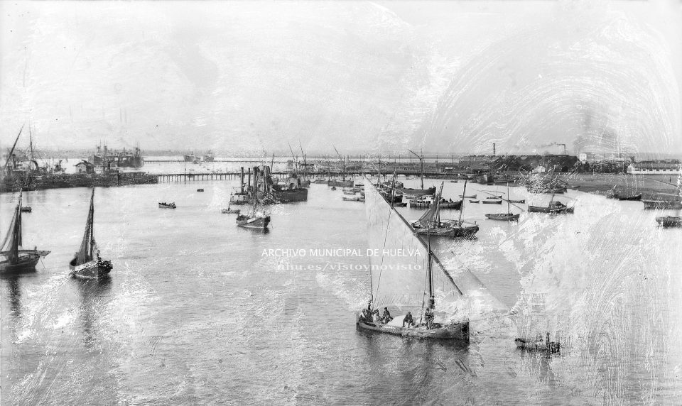 Las imágenes que guardan nuestros archivos atesoran la memoria gráfica de la ciudad. Y así lo muestra esta animada vista del frente fluvial onubense en el tránsito del siglo XIX al XX, al confrontarnos con el incesante trasiego de mercancías en barcos de vela y buques de vapor que acogen para su exportación los desaparecidos muelles Sur y Norte, el denso humo de las chimeneas o las inéditas formas de la nueva arquitectura de templetes, estaciones, fábricas y almacenes, fieles testimonios todos ellos del ritmo frenético y la efervescencia que vive Huelva en su amanecer industrial de estos años. Valor incalculable el de estas imágenes, para el desciframiento y comprensión de nuestro pasado inmediato y sus repercusiones urbanas.